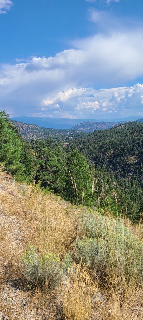 Today was to be the first of a number of days cycling off road on the Kettle Valley Rail Trail. Starting in Princeton the goal was to cycle to Summerland approximately 100 kms away. We started but all agreed after only 5 miles that it wasn’t an option. Two days of rain had made what was difficult near impossible. We estimated at the rate we were able to move the trail ride would be over 10 hours in duration. Fortunately the Princeton-Summerland Road runs close to the trail. The result was a much more enjoyable ride even though we significantly increased the elevation we encountered. The scenery was stunning and there is no better way to enjoy it than cycling. Deer ran along the roadside and we encountered very little traffic. Unfortunately after about 50 km the paved road turned to gravel for the next 40 km. The elevation gained during the ride exceeded 3,600 feet while the descent exceded 4 000 feet. Overall this was a spectacular day. One we all agreed was the best so far. At the end of the day we located a free place to camp with a beautiful view over the valley. Bonus.