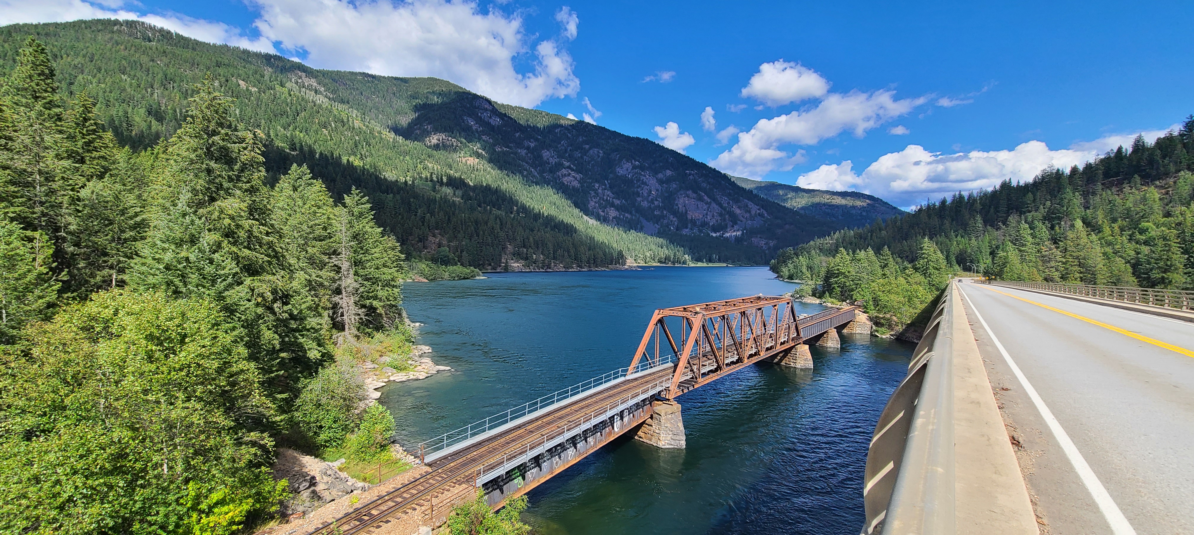 Grand Forks to Christina Lake was a relative easy 19km run. In Christina Lake we stop to see Tom at Smoochies for a coffee and pastries. Next the Paulson Pass, another significant mountain pass that was made more challenging by the almost non-existent shoulder. At the top of the pass we were faced with strong, cold winds and driving rain that had already started to pool on the road. A situation I wasn’t very comfortable with. Fortunately this didn’t last for long and as we came down the other side we rode out of the rain and back into a sunny day. Between Castlehar and Nelson Deb and Terry pulled the RV over at a pre-determined spot so that I could participate in a friend’s and family Zoom call with my mom for her 100th birthday. Note we are still awaiting the commemorative letter from the Queen.