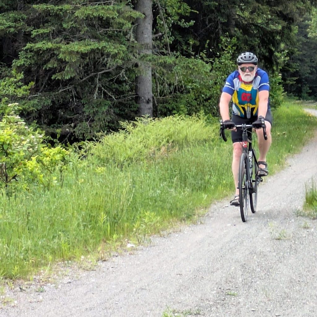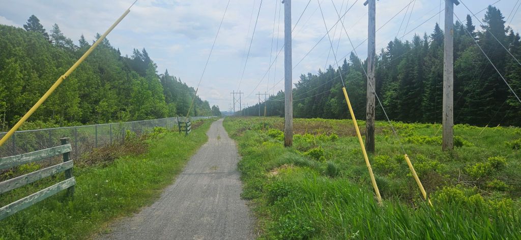 The Petit Temis is the first interprovincial trail in Canada. It is dotted with several rest areas (one every 2 km on average) and is entirely reserved for cyclists and pedestrians. We have been warned that there is work being done on the trail and we will need to leave the trail for an approximate 4 km section. Starting June 20th they have a shuttle that will transport cyclists around the construction but for now you need someone to transport you. Fortunately, for us we have Deb. The trail is hard packed cinder and has been stone dusted. We notice that the majority of the direction we are headed is slightly up and even thought the grade can’t be more than 4% when it goes on for miles it is draining. We are both happy when we reach the closure and cycle off the trail to find Deb waiting along the road. David comments on how he is amazed that every time we need, Deb is waiting for us in the exact right spot.